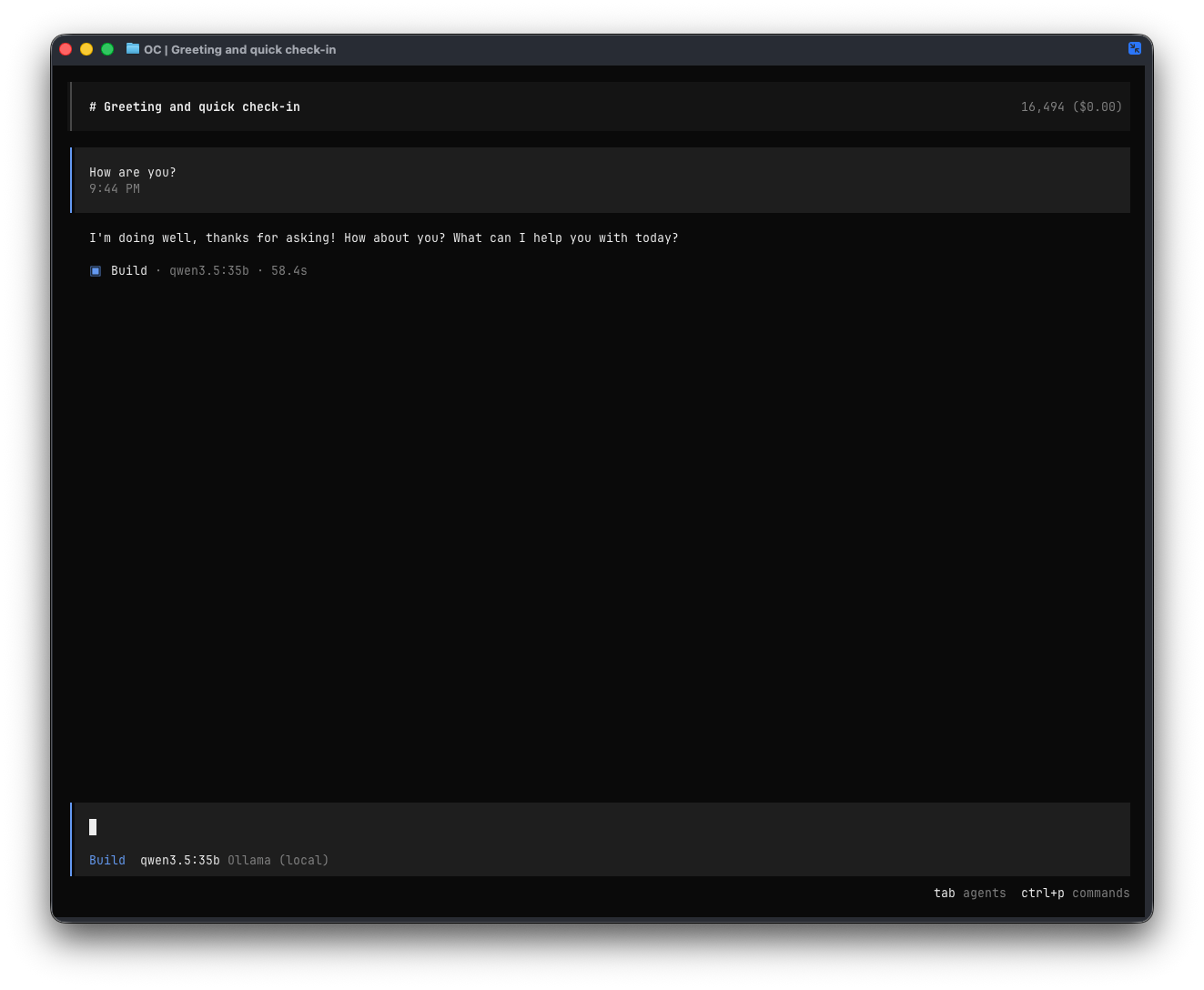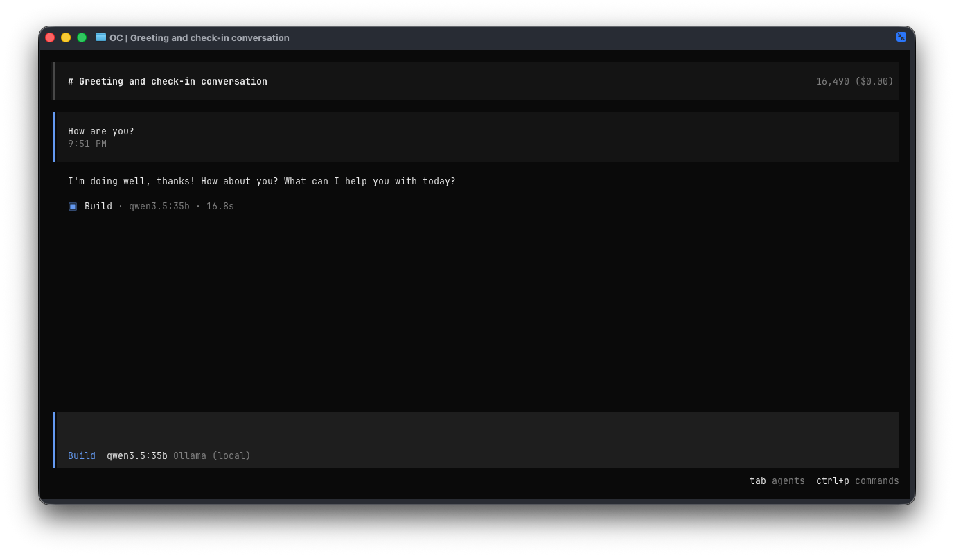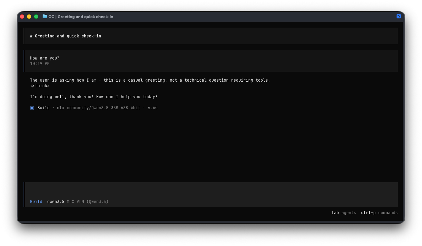You can now enter a prompt and test the latency. On my machine, the first ollama run for qwen3.5:35b with “How are you?” took 58s 2 (cold start, including model load):